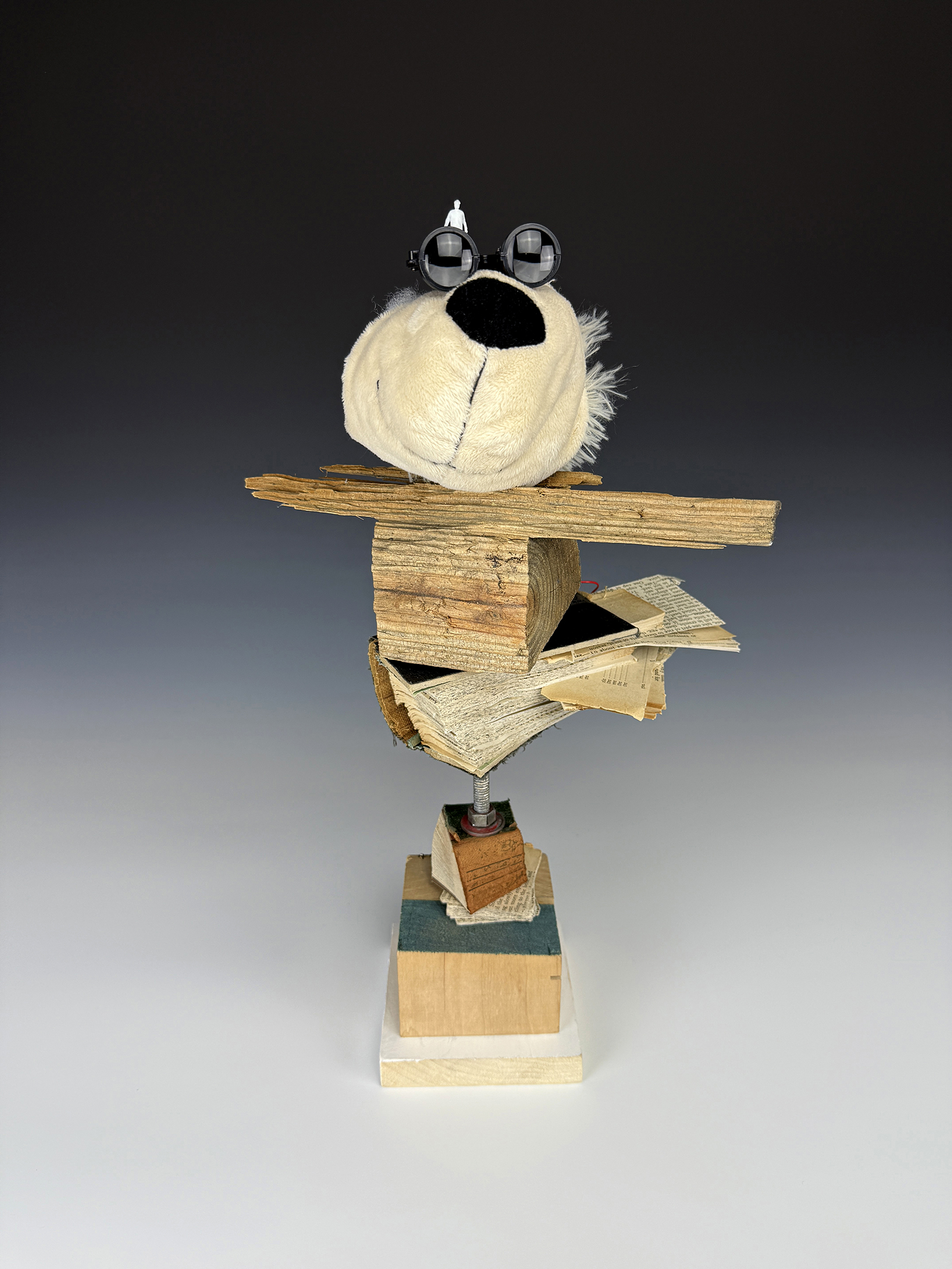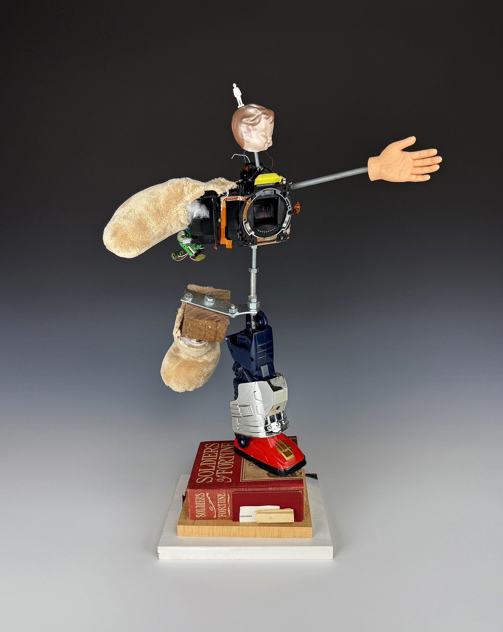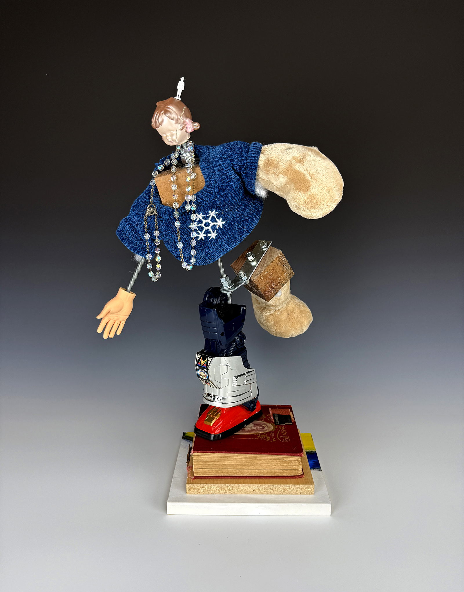 Robot 2 robot, miniature man, frame, cardboard, metal, drywall, chipboard, black walnut, book, QR code, video, 14.5″h x…