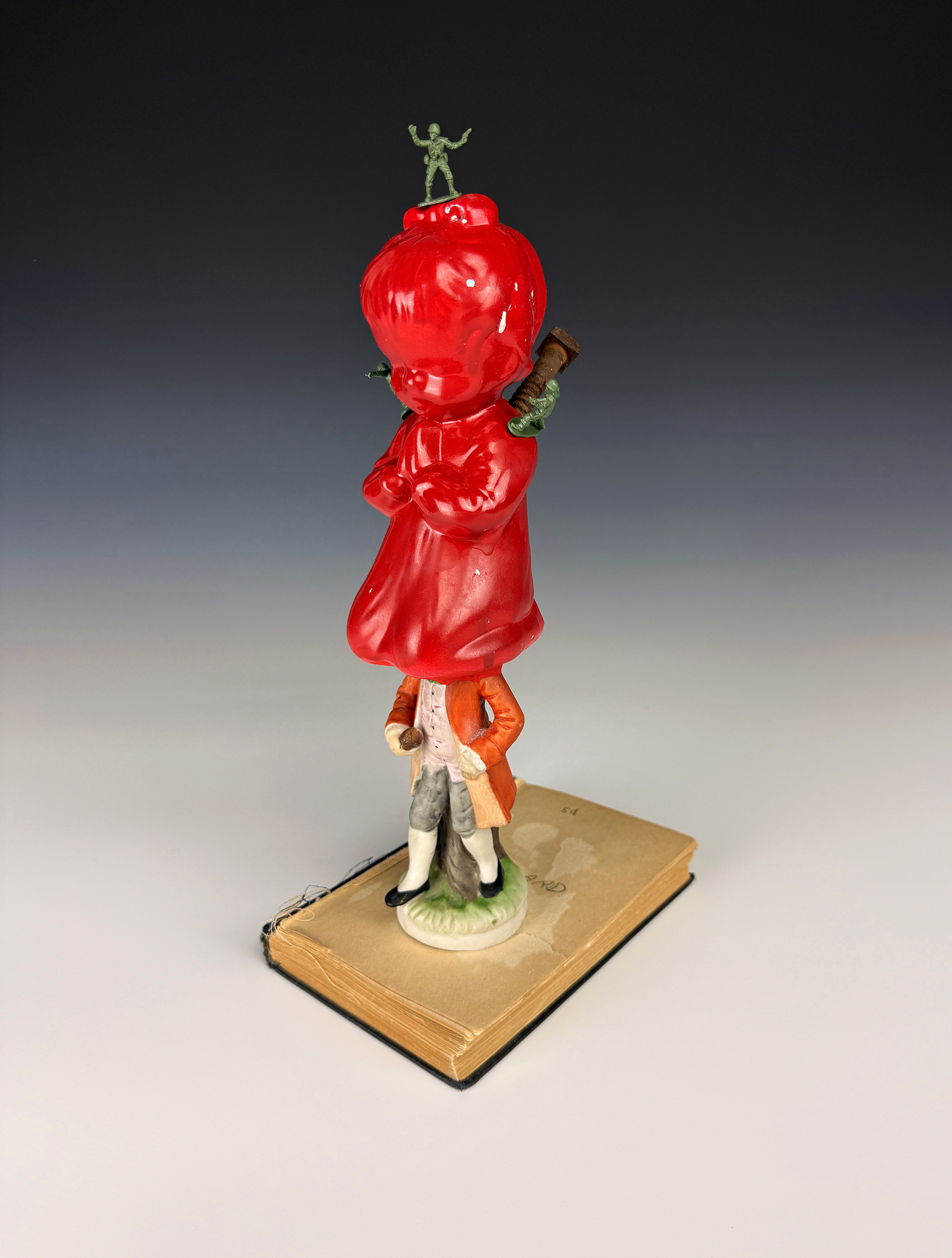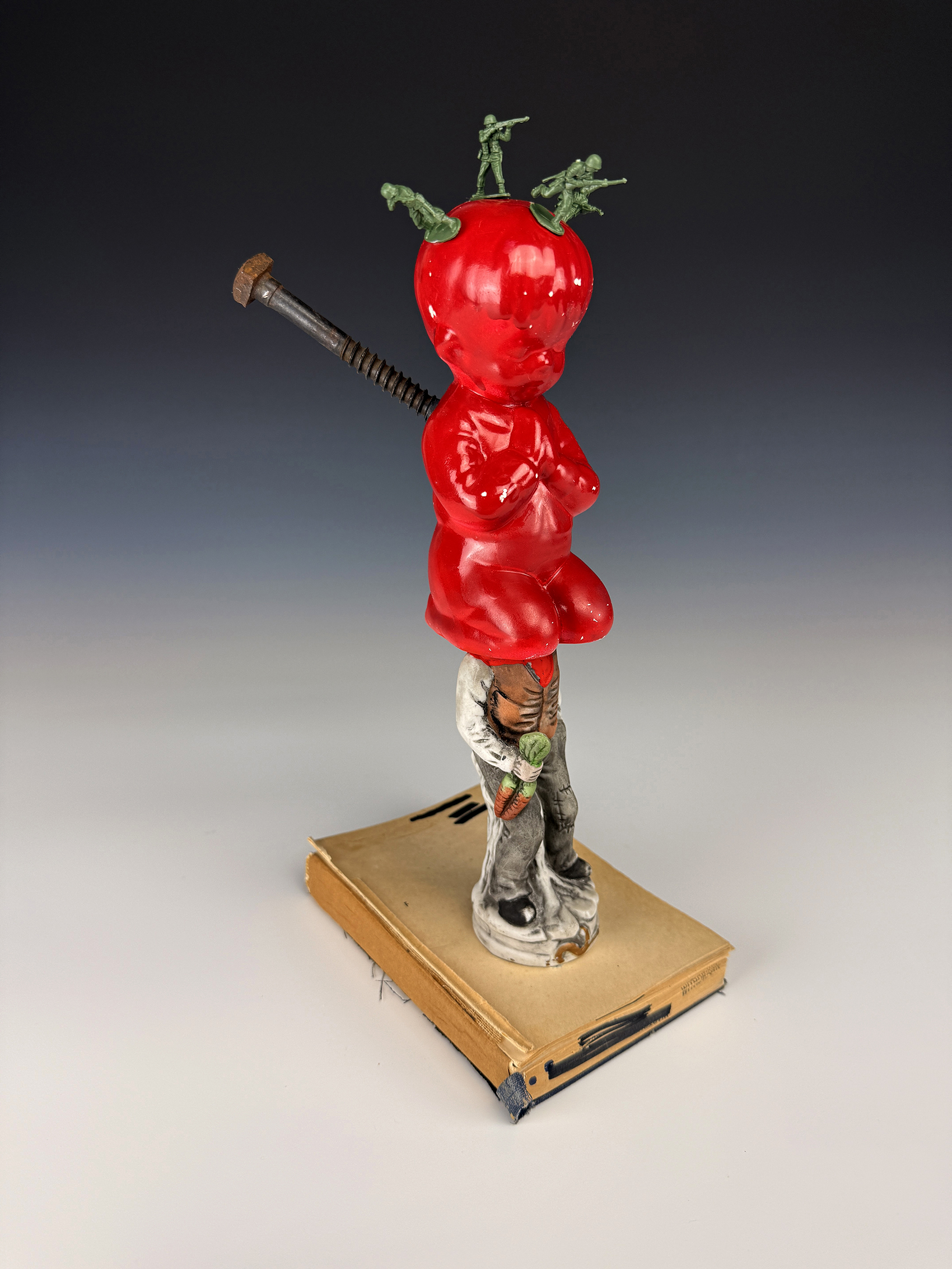 left frame, plastic miniature people, mat board, epoxy clay, wood, plaster, plastic, drywall, cardboard, fabric, nail, string,…